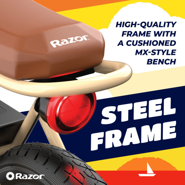 A high quality steel frame paired with a cushioned MX-style bench style seat means you are ready to enjoy a laid back cruise around the neighborhood.