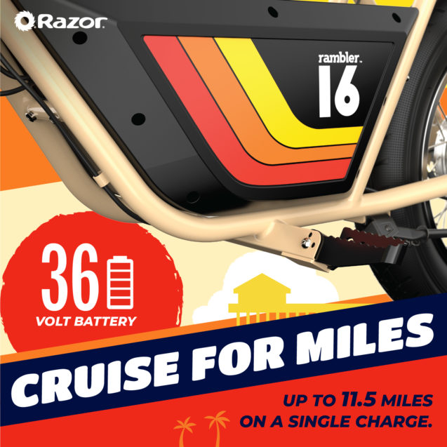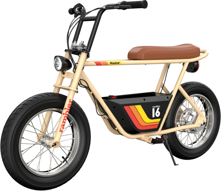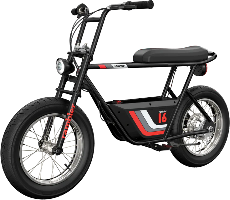 The Razor Rambler 16 is a modernized take on the retro mini motor-bike phenomenon. Super cool styling with vintage graphics. The powerful, and quiet 350-watt motor lets you ride at speeds up to 15.5 mph (25 km/h).